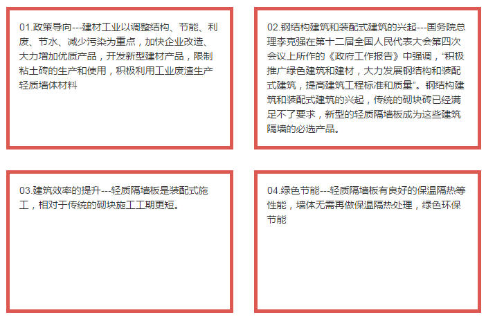按照國家十三五規(guī)劃,至2020年,我國裝配式建筑要占全部建筑中的比重不低于30%,那么,在未來五年,新型裝配式墻體材料及相關(guān)產(chǎn)品將有幾十倍的增長。《國家"九五"計劃與2010年國家經(jīng)濟發(fā)展鋼要》再次強調(diào)"建材工業(yè)以調(diào)整結(jié)構(gòu)、節(jié)能、利廢、節(jié)水、減少污染為重點,加快企業(yè)改造、大力增加優(yōu)質(zhì)產(chǎn)品,開發(fā)新型建材產(chǎn)品,限制粘土磚的生產(chǎn)和使用,積極利用工業(yè)廢渣生產(chǎn)輕質(zhì)墻體材料"。