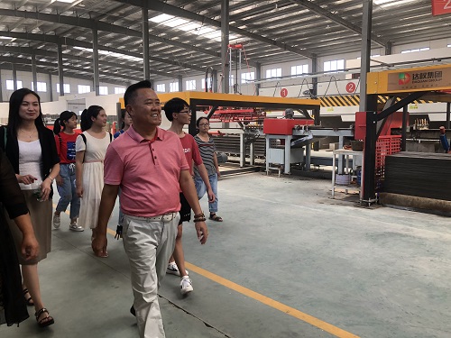 (集團(tuán)董事長龐總帶領(lǐng)學(xué)生參觀混凝土墻板生產(chǎn)線)